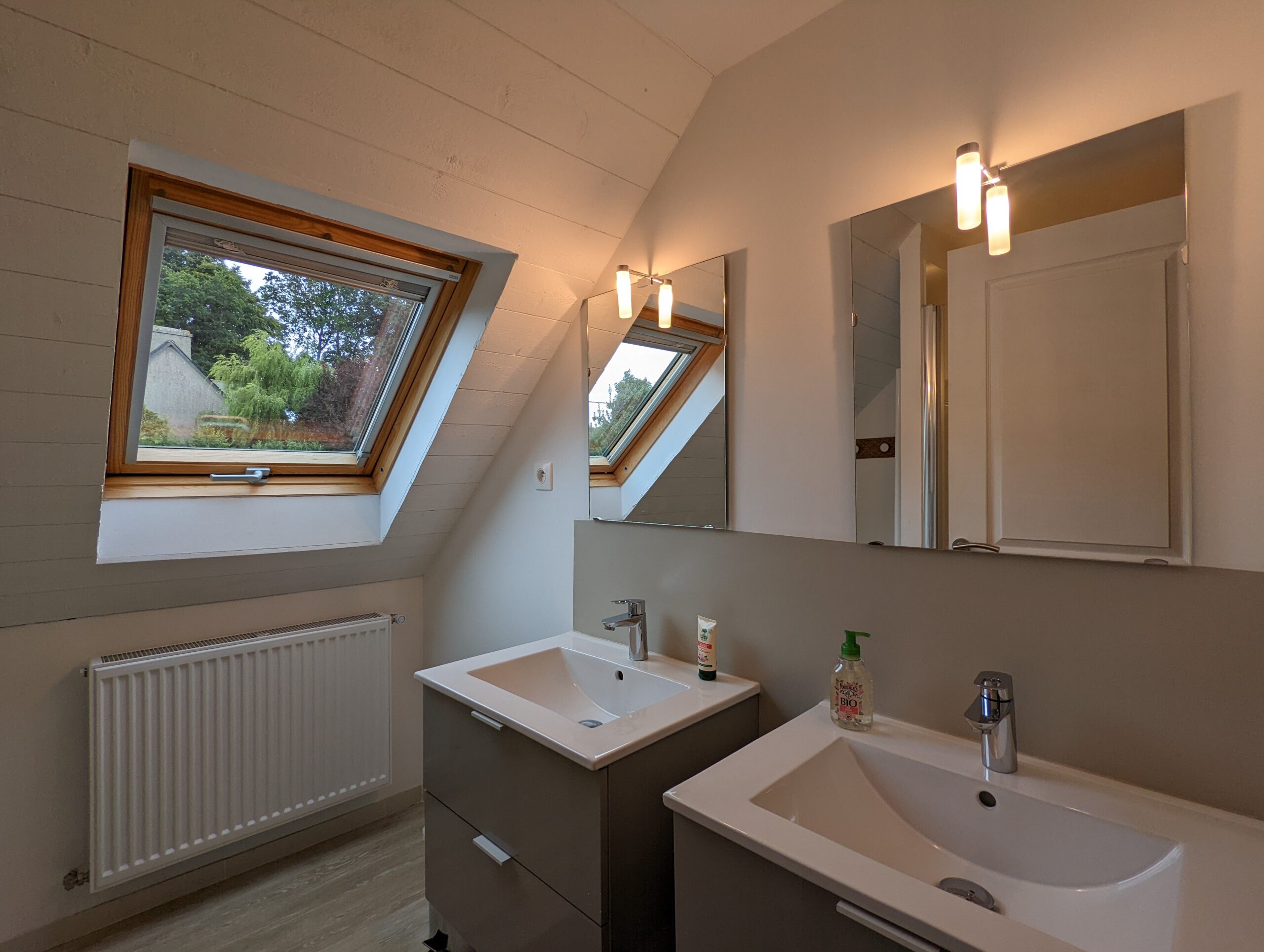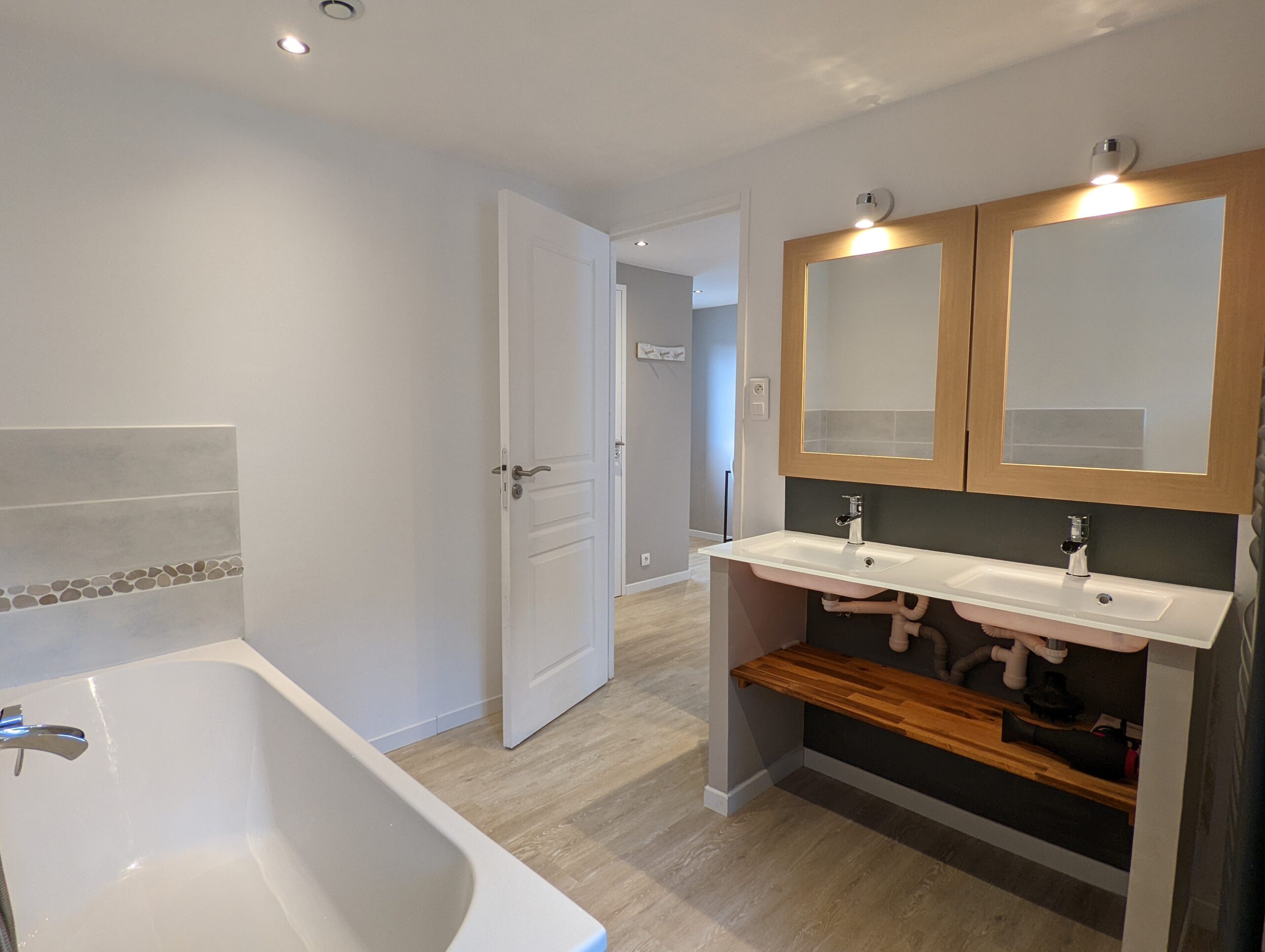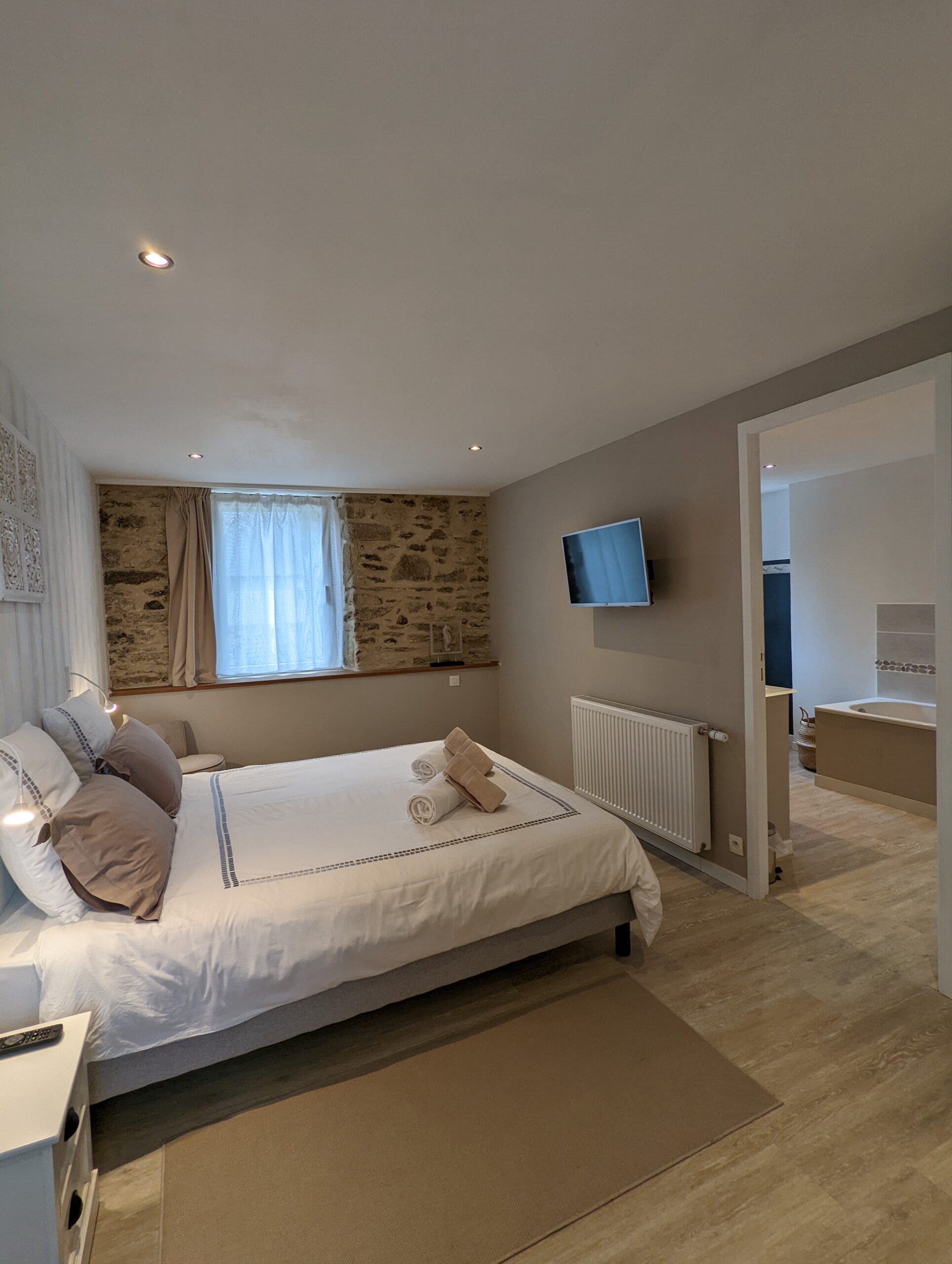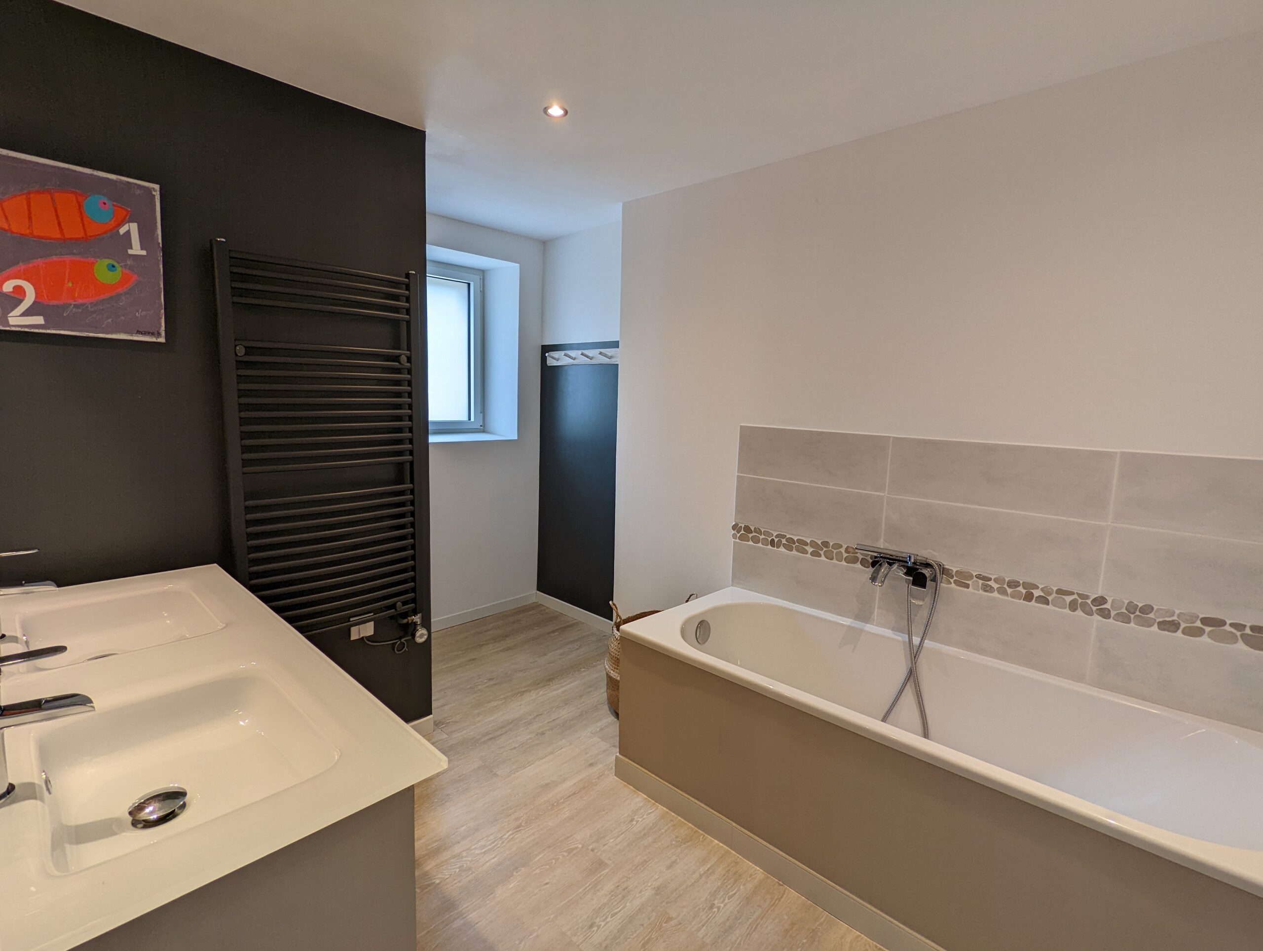 Au premier étage, vous retrouverez 1 chambre parentale avec baignoire+douche et une chambre double avec douche.