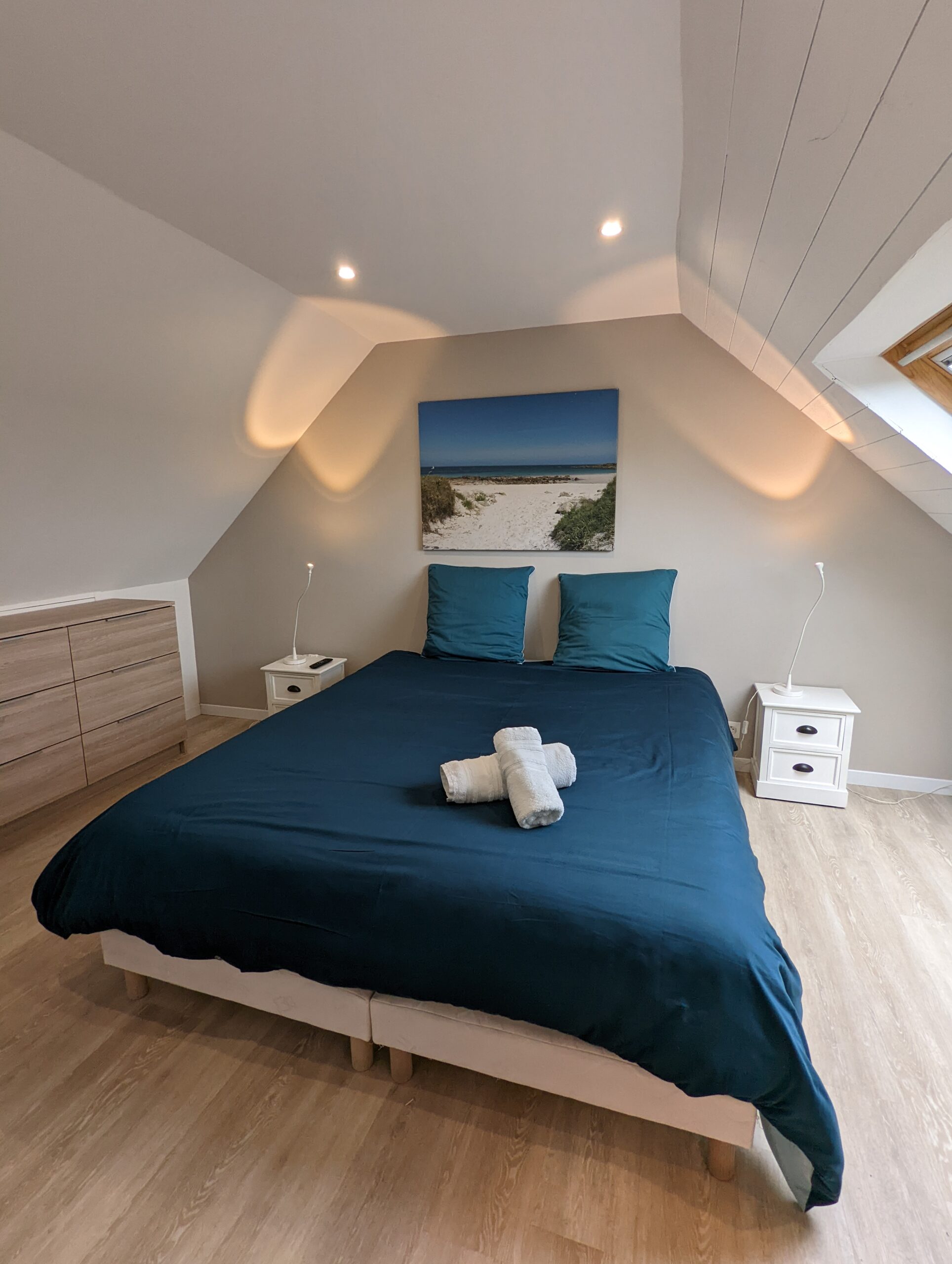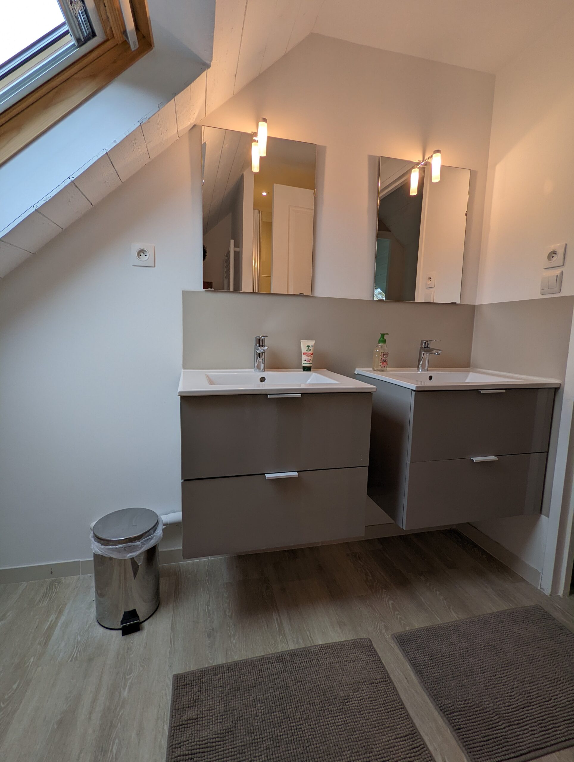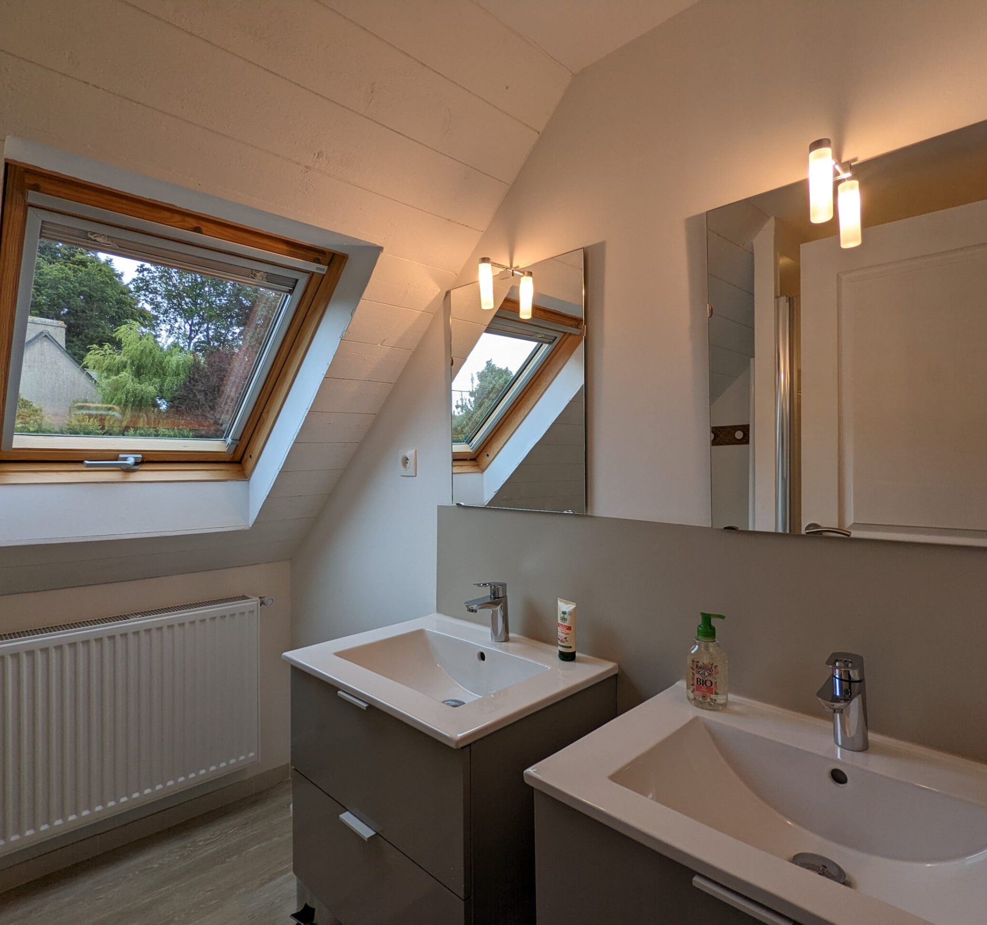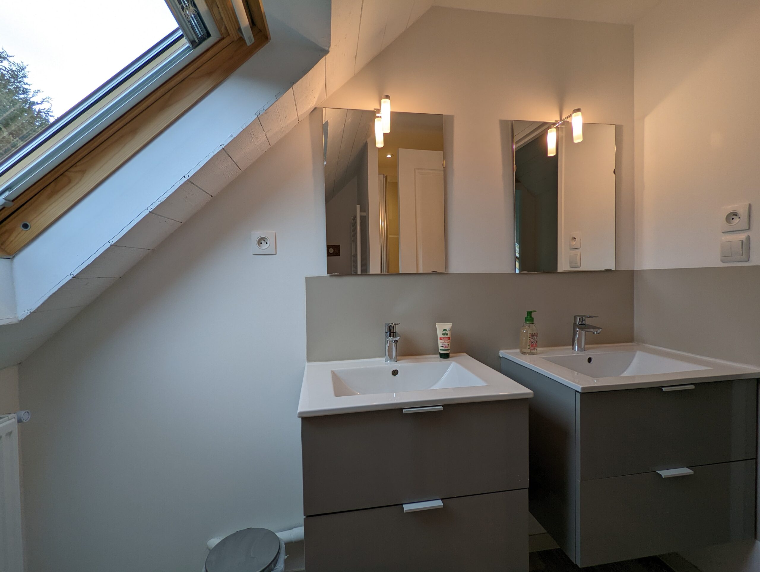 Au premier étage, vous retrouverez 1 chambre parentale avec baignoire+douche et une chambre double avec douche.