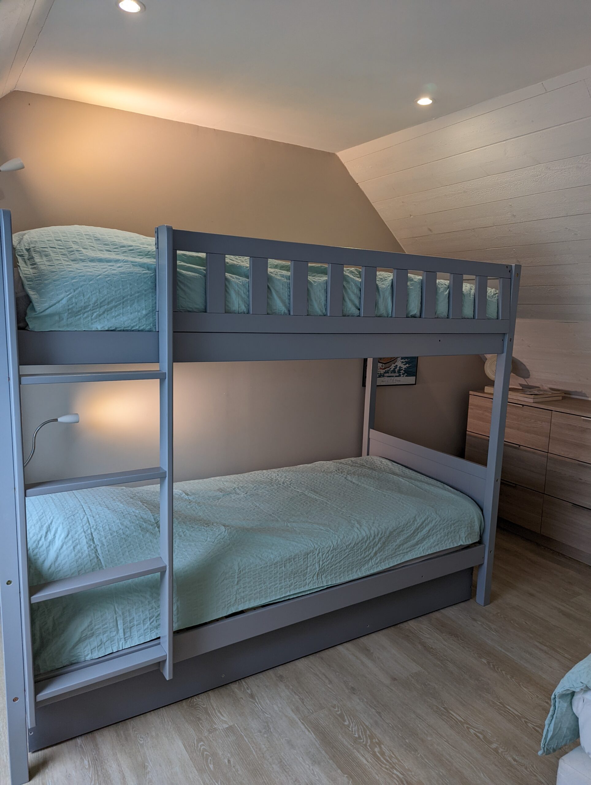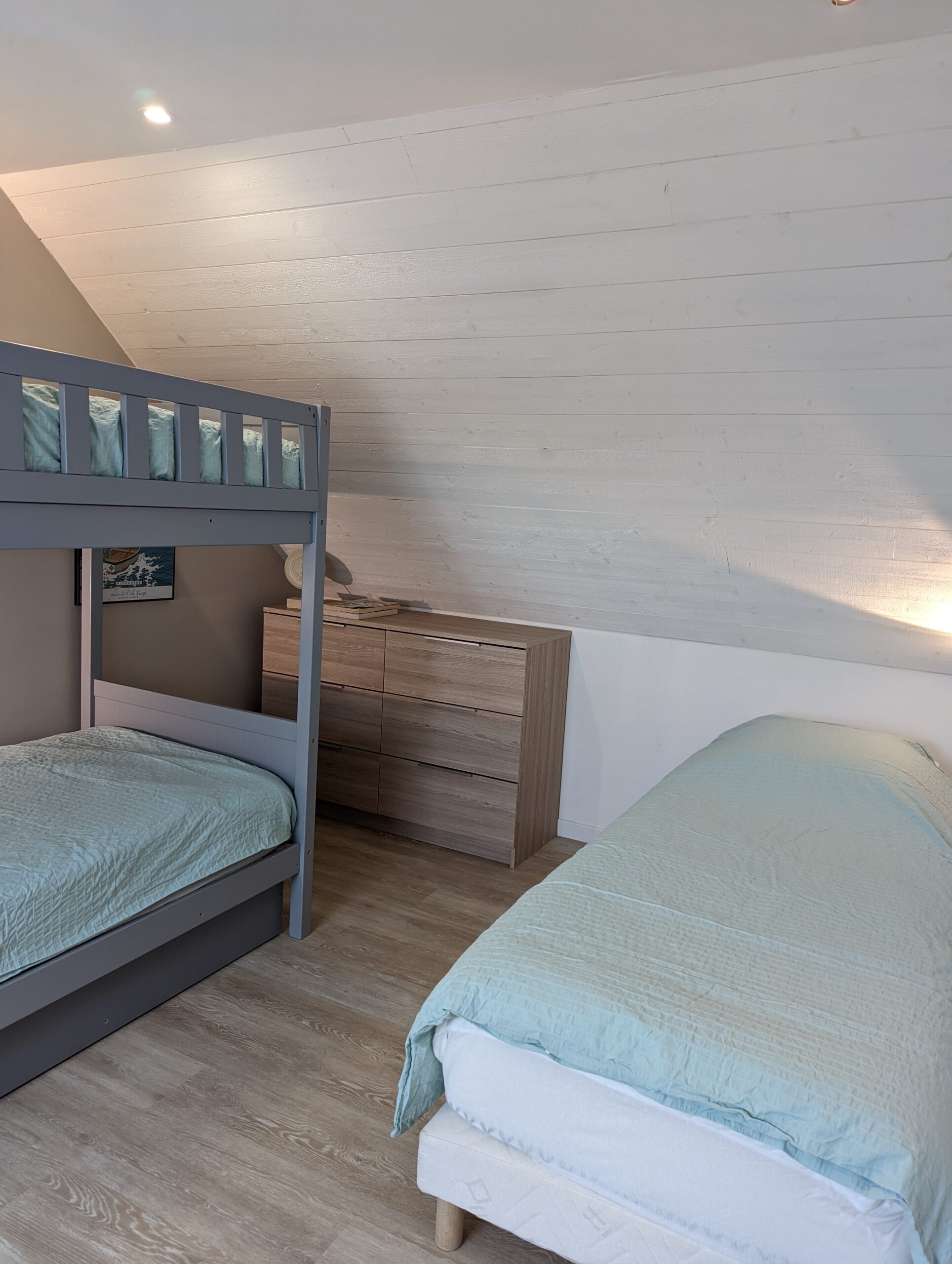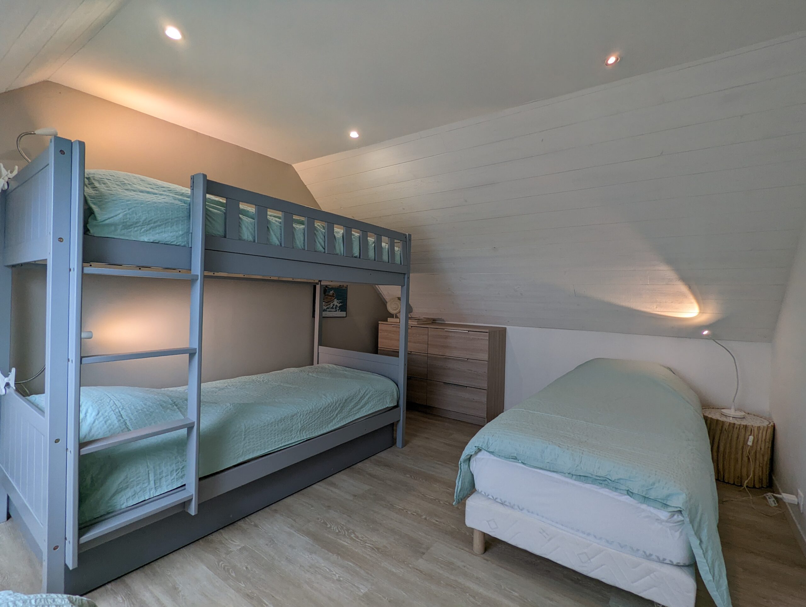 Puis au second étage, une chambre double avec WC, une chambre dortoir avec 4 lits simples et une salle d’eau commune.