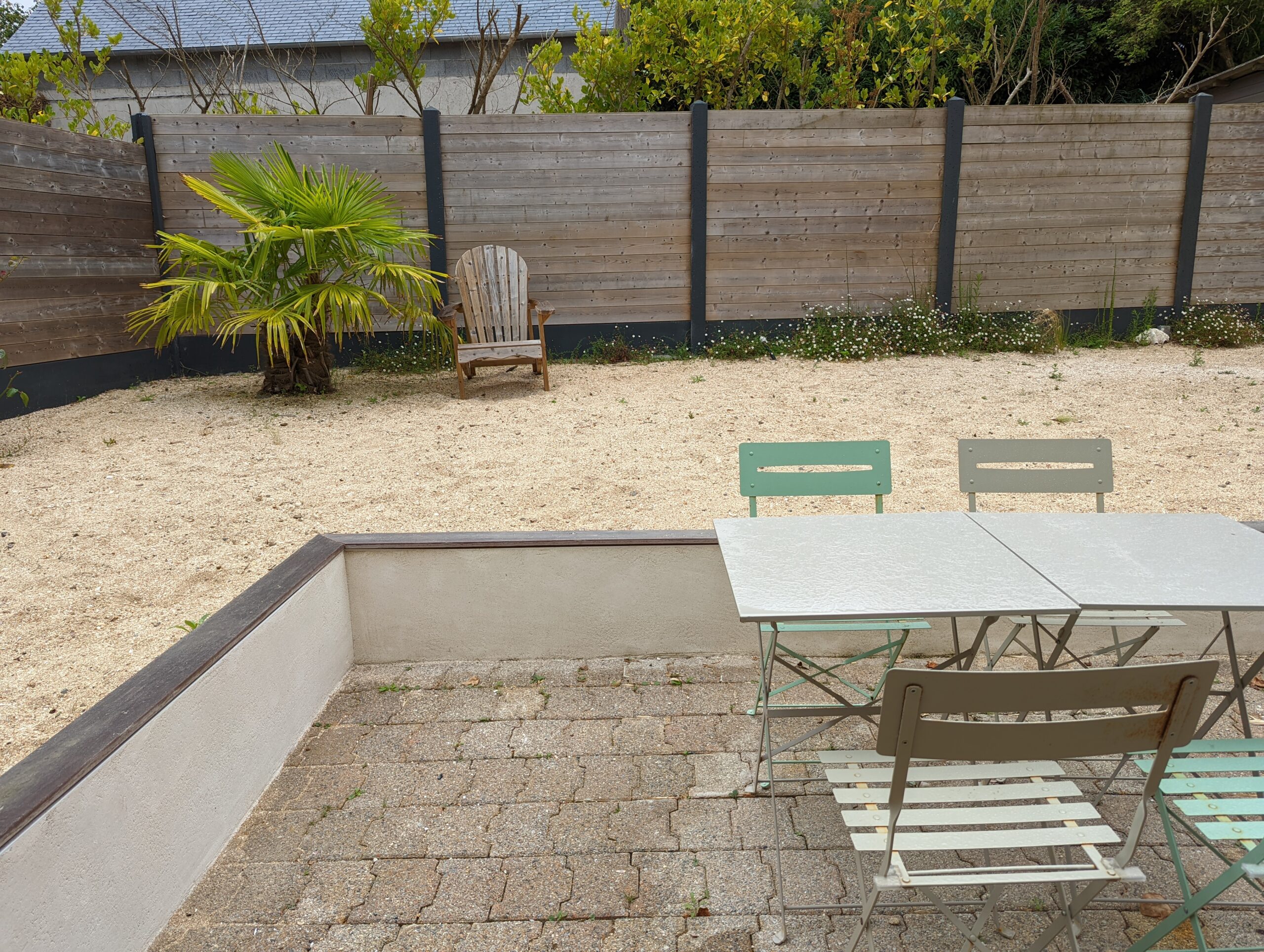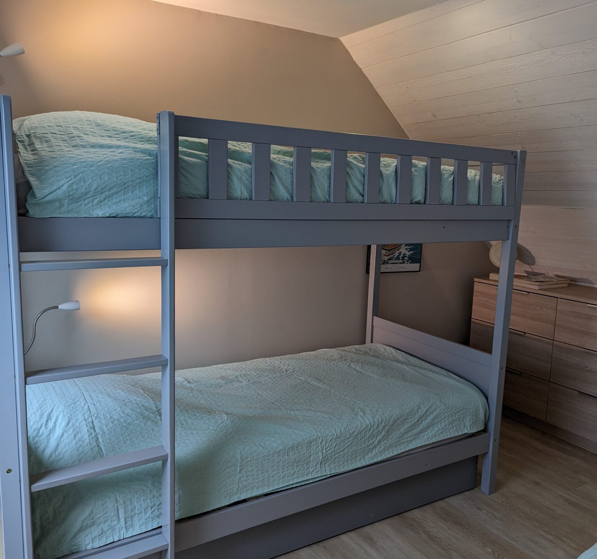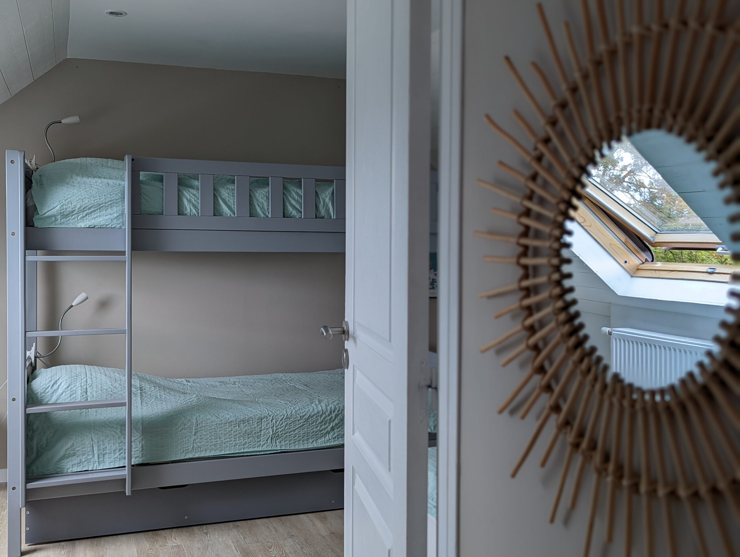 Puis au second étage, une chambre double avec WC, une chambre dortoir avec 4 lits simples et une salle d’eau commune.